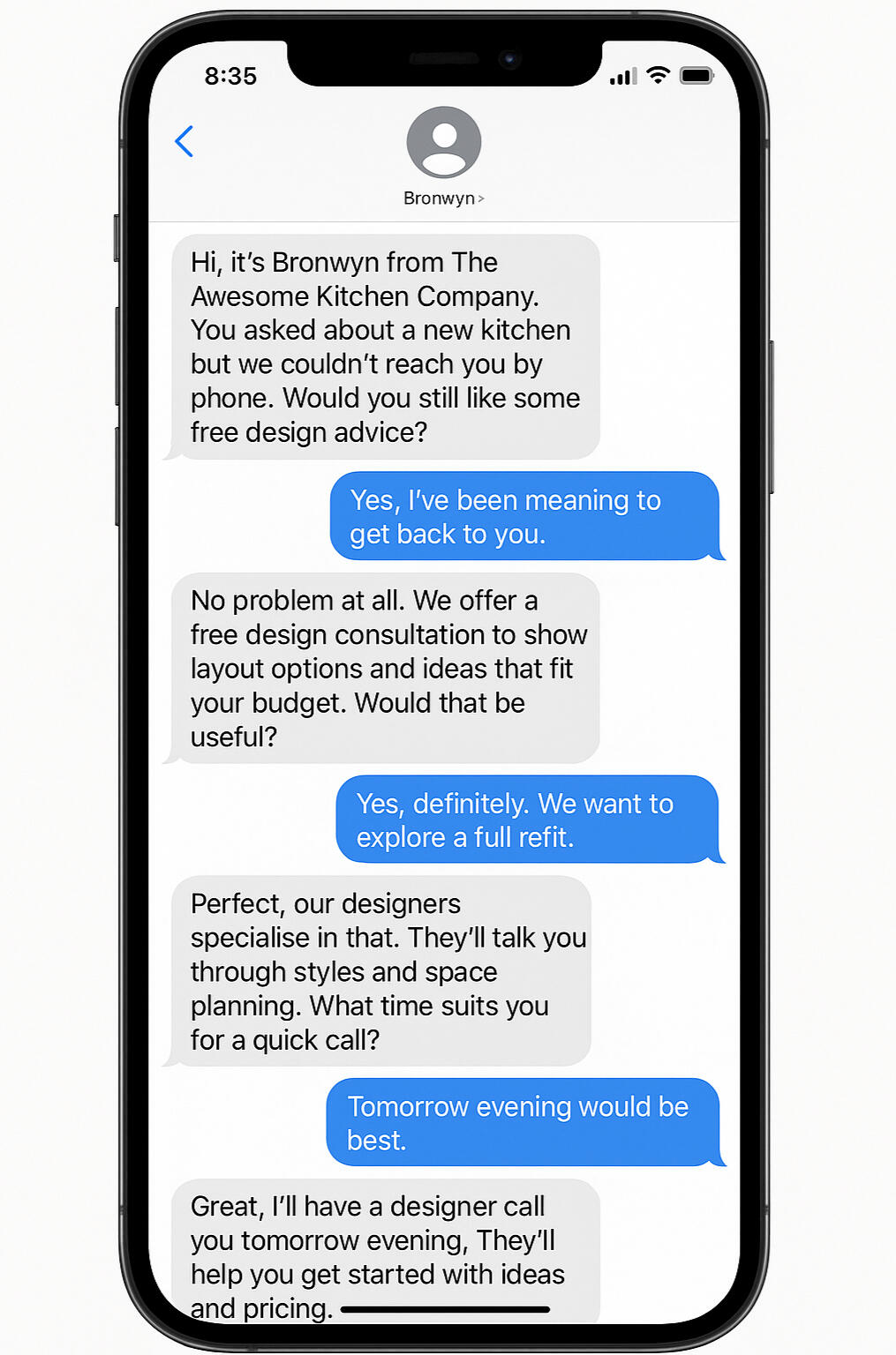 Keen to find out more?Book a free 30 minute online demo with us and we'll demonstrate in real time how our AI agents work.We'll show you how an AI agent interacts with a cold lead—you'll see them deal with real customer responses in a natural, human-like way, helpfully answering questions and handling objections—steering them towards the all-important sales call with one of your sales team.You'll even have the chance to put it to the test yourself, asking it questions and running it through its paces.So get in touch—we'd love to show you what we can do for you.
